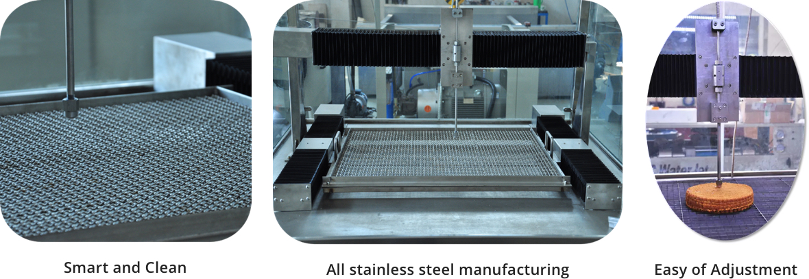 Качество резки зависит от вида, температуры и скорости резки продукта.Средняя скорость резки составляет около 3-5 м/мин, при резке мусса или печенья скорость может достигать 10 м/мин. Самым большим преимуществом гидроабразивной резки является экономия времени при использовании чистой воды в качестве раствора для резки пищевых продуктов.Поскольку лезвия ножей никогда не используются, нет простоев при замене или заточке затупившихся лезвий.